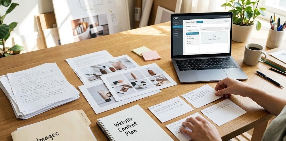 This phase can take 1 day to 2 weeks, depending on how prepared your materials are. Content drives the entire build, so you collect everything early. Like your text, brand visuals, product information, and media assets. If your site uses a CMS, you also prepare structured items like blog posts, categories, or product groups. Once you organize this content, the rest of the project moves faster because you’re working with clear and complete materials.