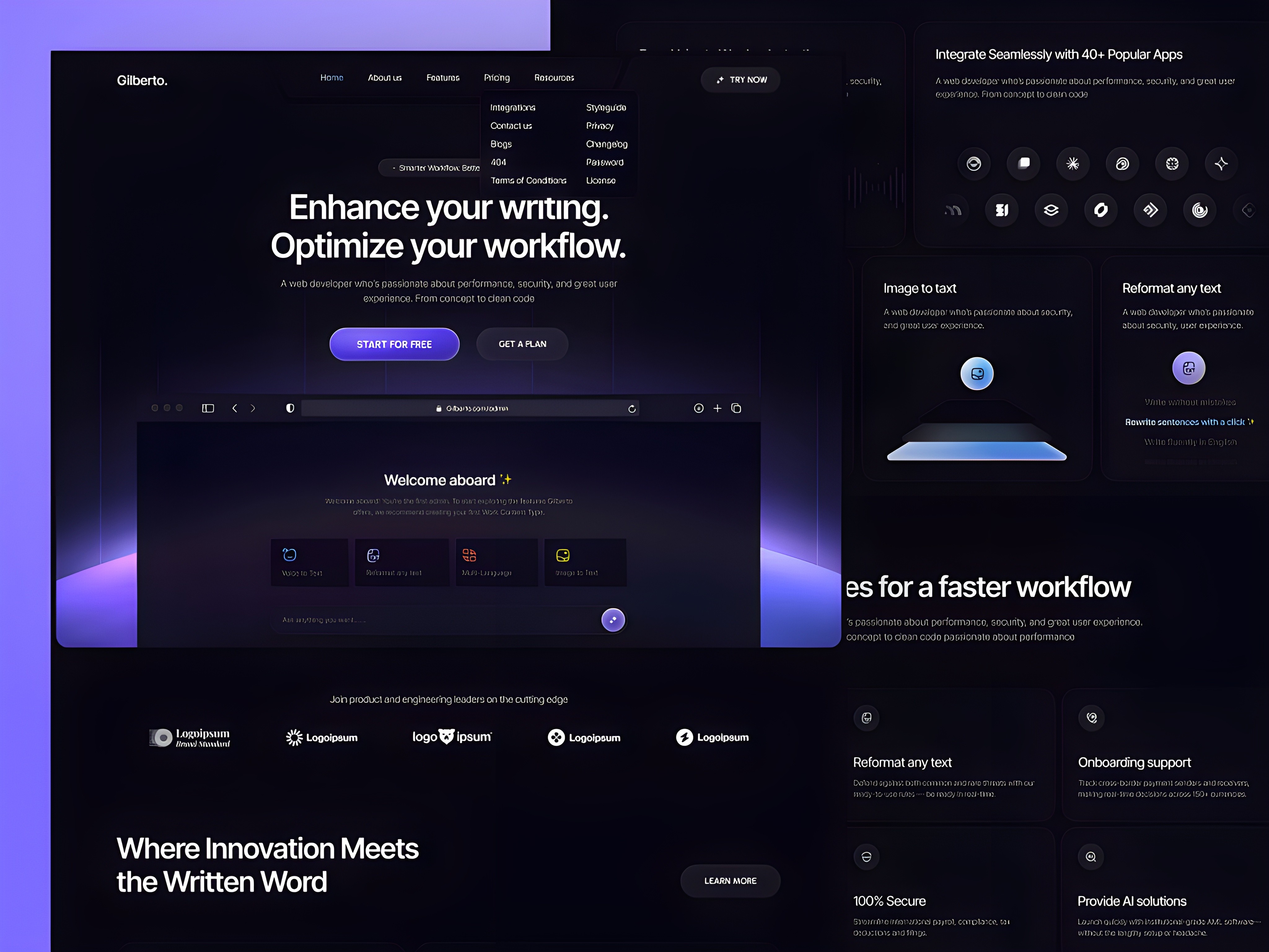 Gilberto is for AI and SaaS startups that want their website to look as sophisticated as their product. The hero ("Enhance your writing. Optimize your workflow.") is a two-line capability statement that does exactly what a startup SaaS hero needs to do: it names what the product does (writing and workflow) and names the outcome (enhance, optimize) without spending 50 words explaining how. The sub-headline — "Where Innovation Meets the Written Word" — adds brand personality without diluting the clarity of the value proposition.