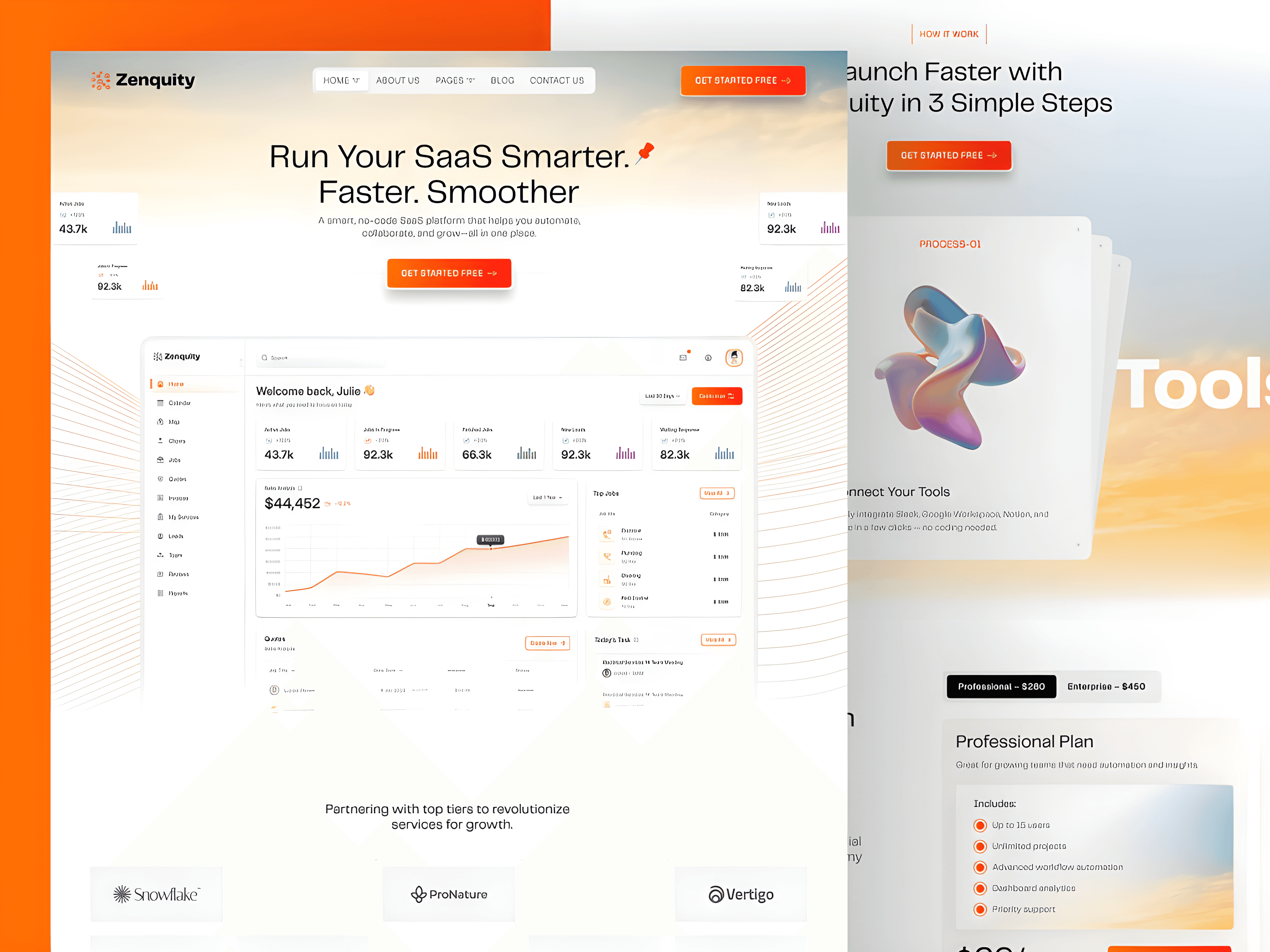 Why it stands out: The three-step onboarding section ("Launch Faster in 3 Simple Steps") is one of the most conversion-effective structural elements a SaaS startup page can have — it answers the "but how does it actually work?" objection before a visitor has to ask. At $79 with the cleanest B2B positioning in the collection, Zenquity is the strongest choice for startup founders who want to look established on day one.