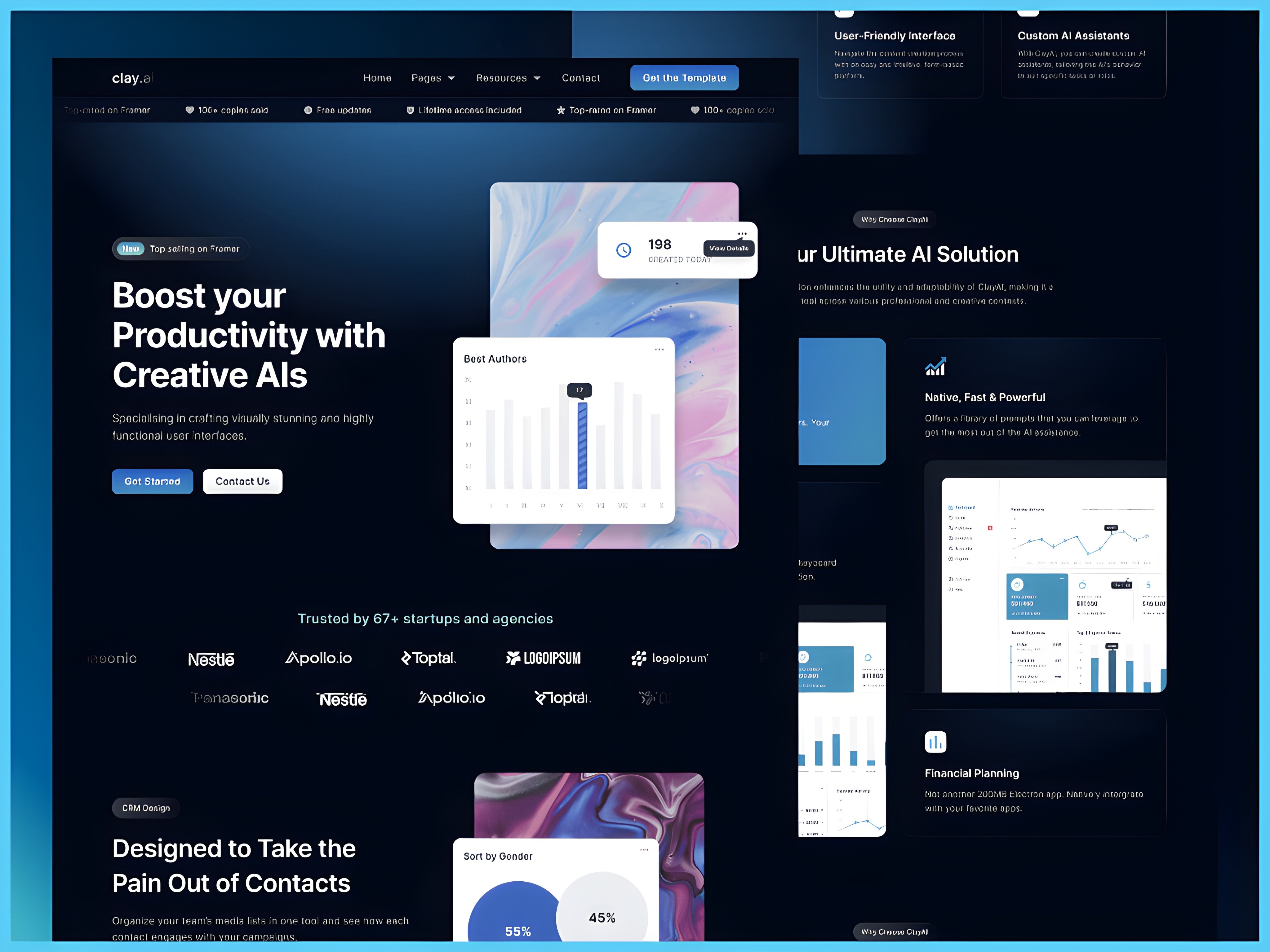 ClayAI is the most complete and conversion-optimized startup template in the Webflow collection — built for AI SaaS startups and multi-feature AI platforms that need to explain a complex, broad product to a non-technical buyer without losing them in the first scroll. The hero ("Boost your Productivity with Creative AIs") leads with an outcome that any knowledge worker immediately connects to, backed immediately by "Trusted by 67+ startups and agencies" and a recognizable client logo grid — the trust structure that every early-stage AI startup needs but most get wrong by burying too deep.