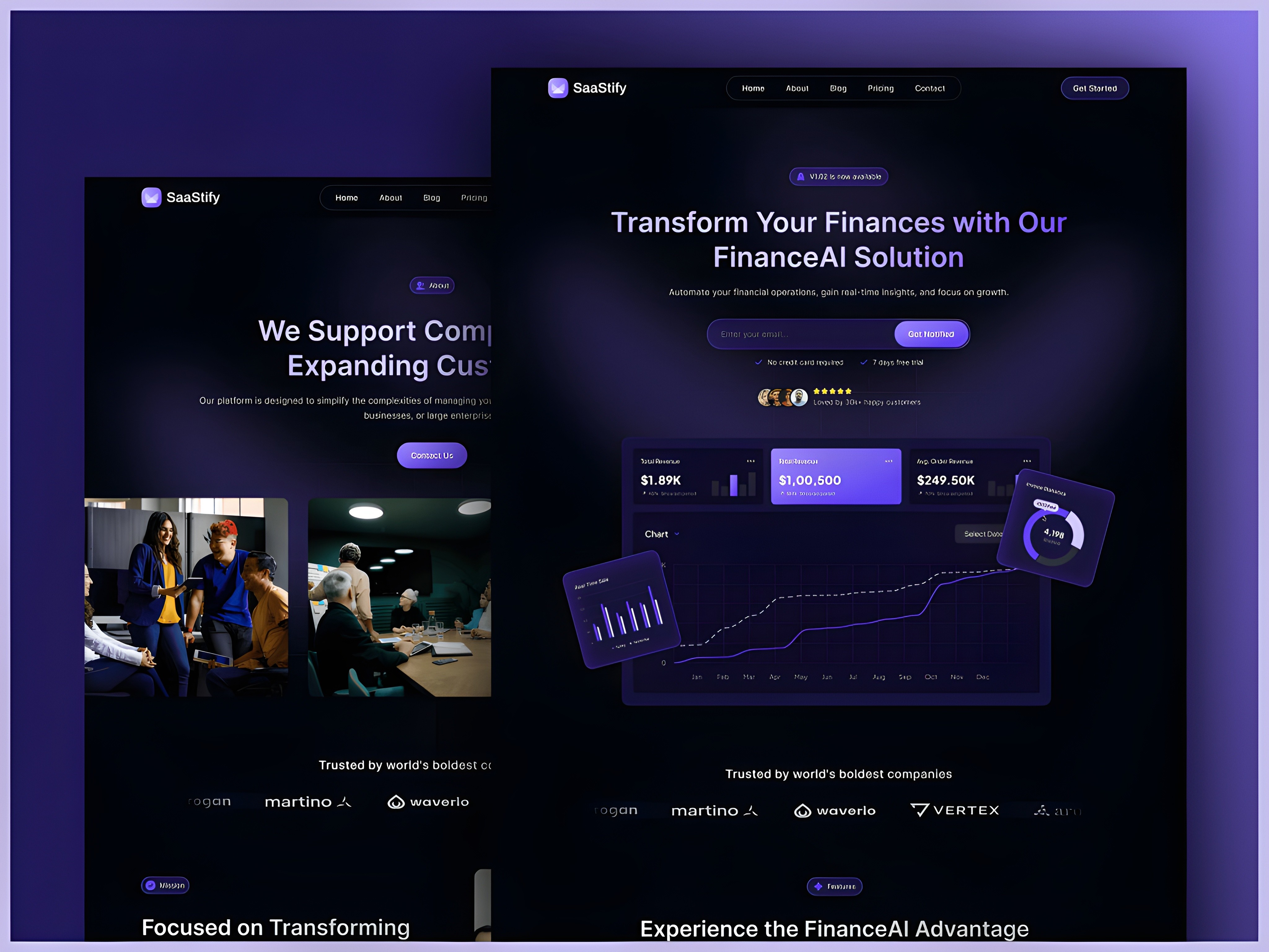 Saatify is the strongest entry point in the Webflow startup template collection — a SaaS-oriented design built for fintech and financial AI startups, priced at the most accessible point in the library. The hero ("Transform Your Finances with Our FinanceAI Solution") demonstrates the outcome-led headline structure that works for startups in technical product categories: it names the domain, names the product type, and implies a transformation — all before the visitor has to read a single feature.