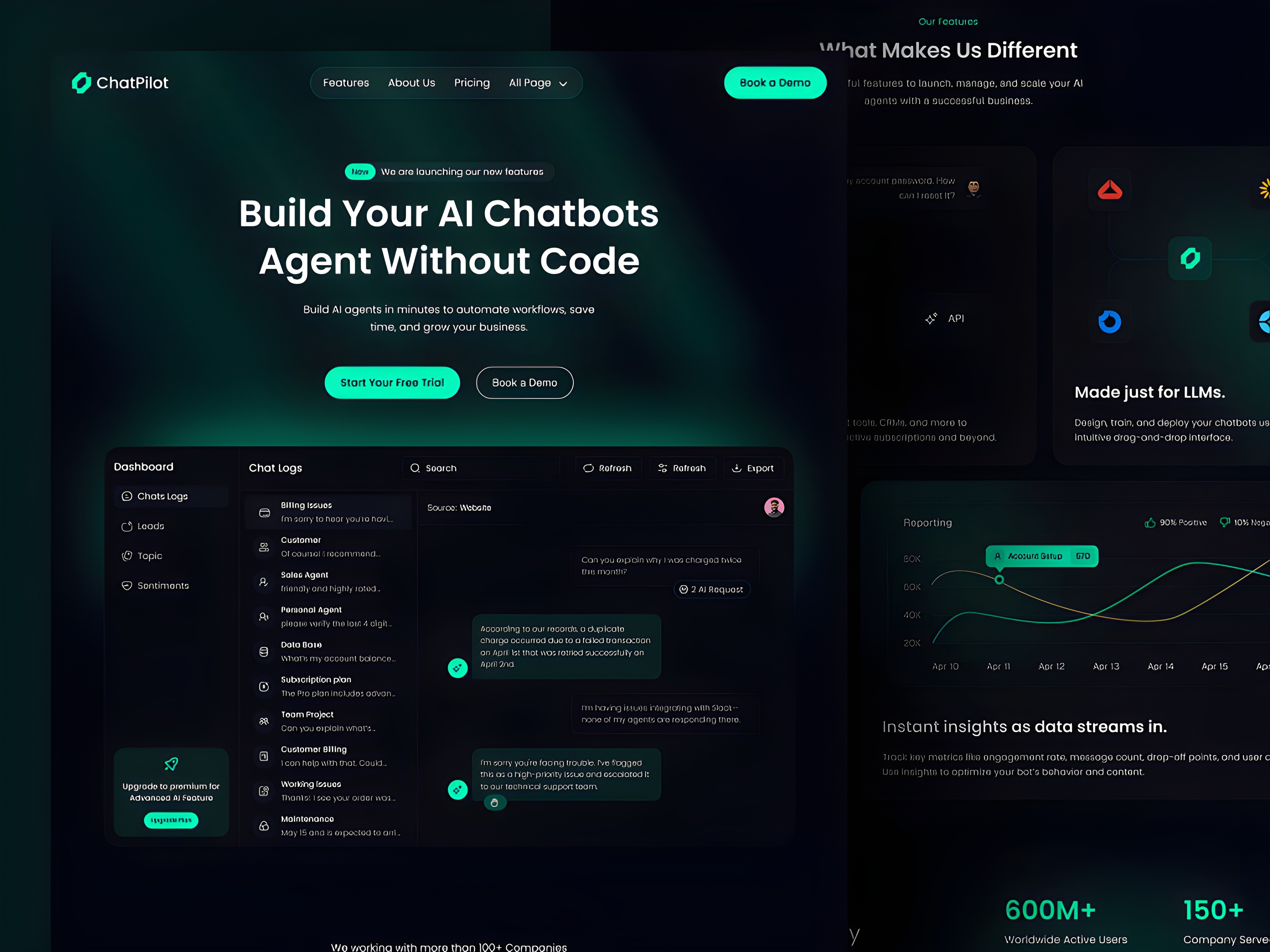 Chatpilot is the only template in this collection built specifically for conversational AI products, chatbot platforms, and AI agent builders. The hero is the most direct in the collection: "Build Your AI Chatbots Agent Without Code." Seven words. It names the product type (AI chatbot agent), names the primary benefit (build it), and removes the biggest objection (no code required) all in a single headline. There is no ambiguity about what this startup does or who it's for.